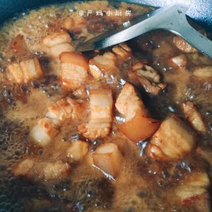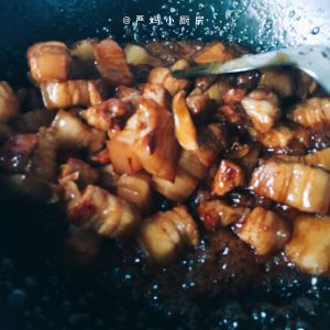 倒入热水盖过肉,添加适量酱油,老抽,最开始因为炒过糖色了,汤汁收干以后颜色会很不错,所以这里少倒入点老抽增色,炖煮五十分钟,肉块小的话四十分就可以了