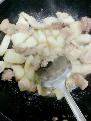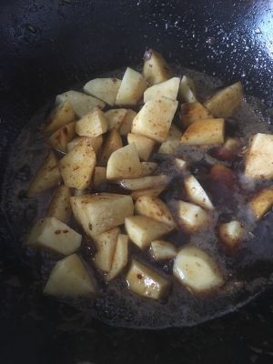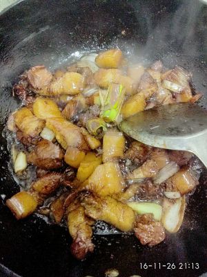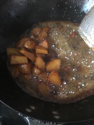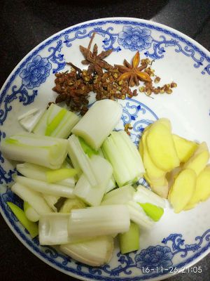 炒至变色,放入姜片葱段花椒八角继续翻炒