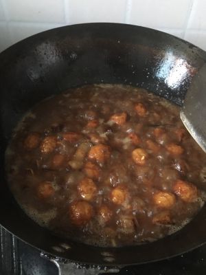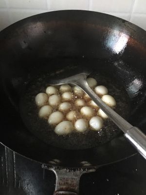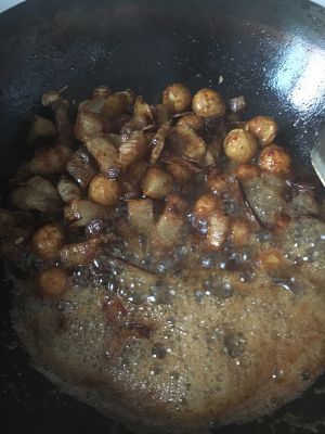 加豆瓣,干辣椒花椒,和肉一起翻炒加鹌鹑蛋,泡发香菇的水焖煮一个半小时,中间鹌鹑蛋入味之后捞出