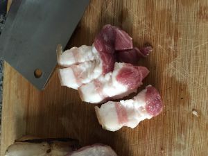 五花肉洗净,切条,再切成5CM见方的块,烧热水焯过沥水。