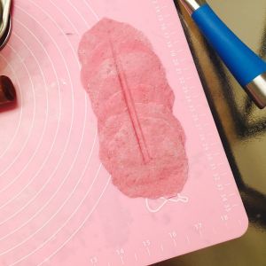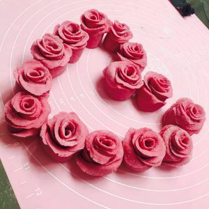 紫薯泥、红薯泥分别加入低粉、发酵粉、少许炼奶混合,再以面团干湿度酌量加少许水,揉成不粘手的面团,分别发酵至1.5倍大,两个面团排气后,分成等份的小面团,取一个色的小面团擀成圆饼,包入另外一个颜色的小面团,收口搓圆,再擀成圆饼,用刀切出一样大小的12个花瓣,再顺着同一方向把花瓣翻开,用手稍微按扁一下即可