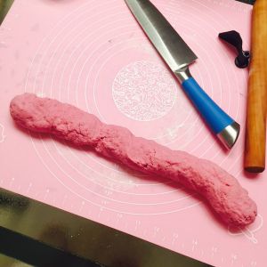 食材放在一起和面,我用的面包机,和面➕发面!发好的面排排气,醒一醒,搓成如图圆柱形