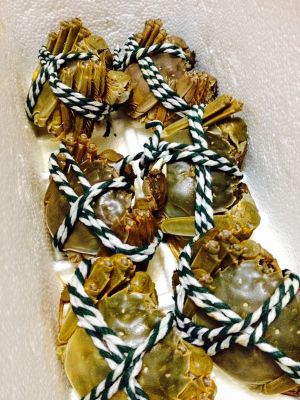 大闸蟹刷洗、流水洗净!绳子系紧。