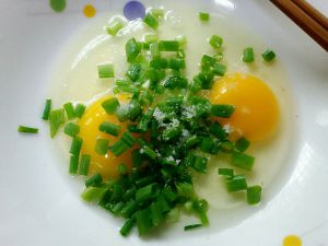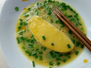 鸡蛋、葱花、盐混合,打散打匀。
