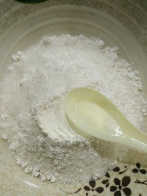忘了说了,这是砂糖,直接撒在面粉上面。就是那种打包的勺子两勺。