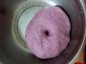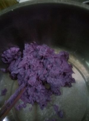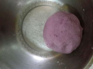发酵好的紫薯面团搓揉至完全排气,再揉成条状后平均分成一个个小剂子,象擀饺子皮一样擀成一个个圆的面皮。