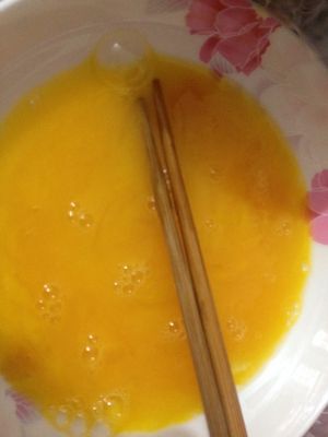 两个鸡蛋加少许盐和胡椒粉,用筷子打发加入一个鸡蛋量的清水,多打一会。