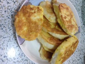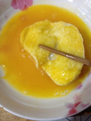 把馒头片放入盘里,两面均匀裹上鸡蛋液