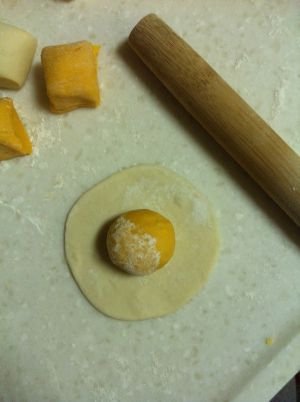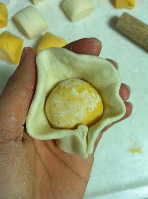 把蕃薯团放入白面皮中,像包包子一样包,收口向下,最后揉圆。