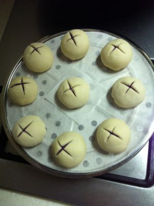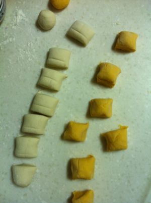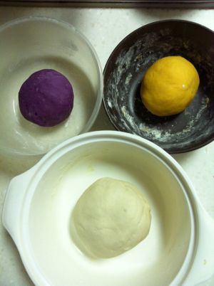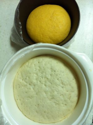 俩色面团分别揉面成光滑的面团,在温暖的地方发酵成约2倍大。
