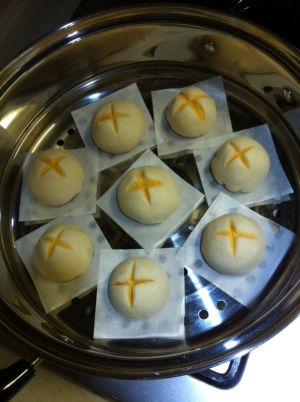 万慕智能升降锅里加水放蒸架,放油纸,放整形后的馒头在油纸上,盖锅盖让它们发酵20分钟,