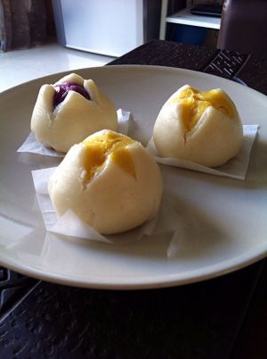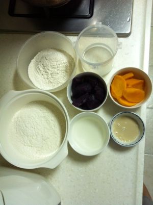 准备以上材料,面粉分成两份各100g,蕃薯洗净切片隔水蒸熟,酵母用温水溶化静止10分钟,细砂糖用沸水搅溶。