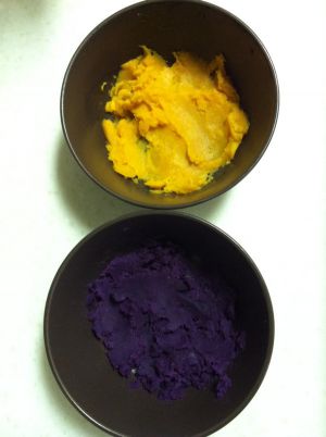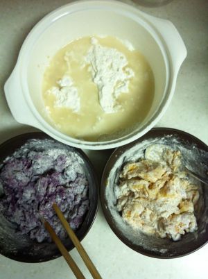 把其中一份100g面粉分成两份加入紫薯、红薯中每份各50g。将酵母、糖水分成3份倒入白面粉、紫薯粉、红薯粉中用筷子搅拌成雪花状。