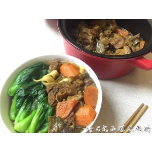 捞出的面淋上红烧牛腩的汤汁 然后码上青菜和牛腩,然后一碗货真价实的红烧牛肉面就大功告成啦