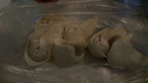 将两个角交叉捏在一起,成抄手生胚,买的馄饨皮比较干不太容易粘合,用擀馅儿的筷子粘上一点馅儿涂在重合处就可以捏紧啦。抄手就这样包好啦