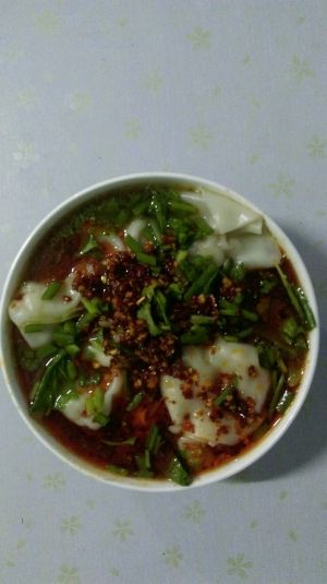 将煮好的抄手捞出装入碗中,撒上适量葱就可以了,淋上红油就可以啦