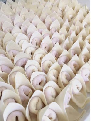 开始包抄手,每个地方有不同的包法,具体的可以找相关视频看看,一学就会,很简单的。包好后,摆放整齐,多余的就放进冰箱冷冻,想吃的时候,开水下锅煮熟。