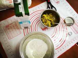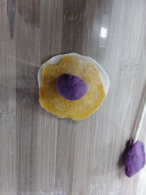 第四步,把面片包好,柔成圆形,拿刀切十字,冷水上鍋醒20分钟,发火烧开水蒸15分钟,闷3分钟揭盖,