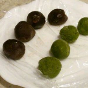 事先把红豆沙,抹茶豆沙搓成小圆。冷藏备用。