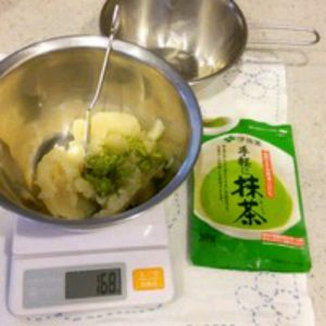 豆沙里加抹茶粉,拌匀,做出抹茶豆沙。(没有白豆沙这步可省,只要是豆沙都可以,什么口味的都可以)