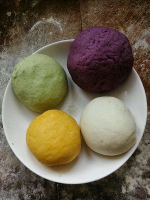 第二步,面团发好排气,然后分别柔成不同颜色的小面团,