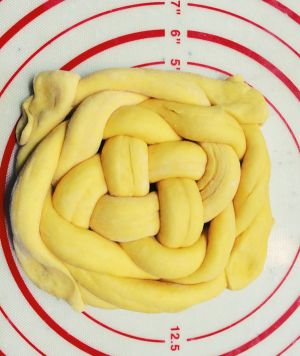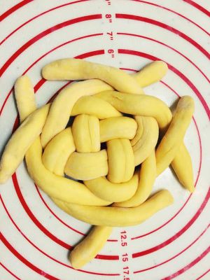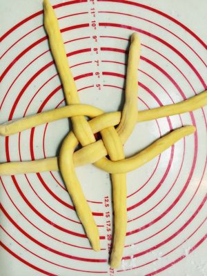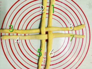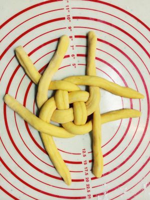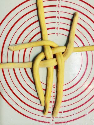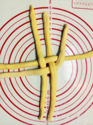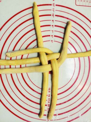 取4个分好的面团,搓成长度相同的长条,大概30cm长