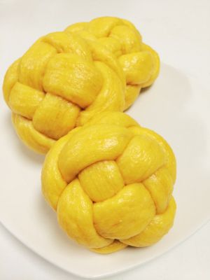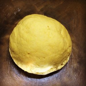 努力揉啊揉,揉成团,在这过程可能需要加水,具体还要看蒸的南瓜水份。然后等发酵成2倍大,就可以玩了