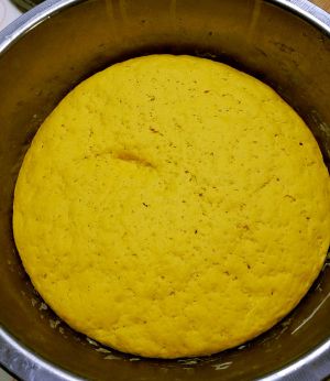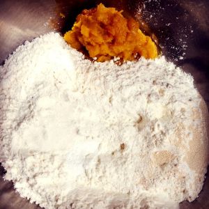 南瓜放凉和面粉酵母和在一起,不需要加水,感觉面软,慢慢往里加,边加边和,放在室温下发酵。大概4个小时面可以用了。
