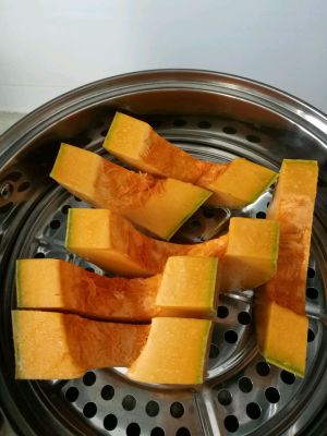 南瓜带皮切成条状放过蒸15分钟。整好后把皮去掉,用筷子搅拌下就变成泥了。