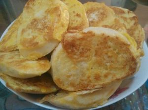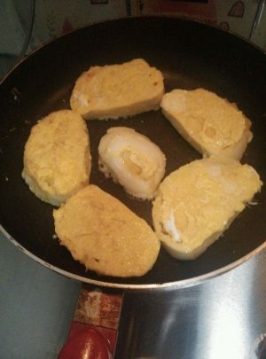 馒头片裹上鸡蛋后,放入油锅……中火五分钟就可以了……期间注意翻面……