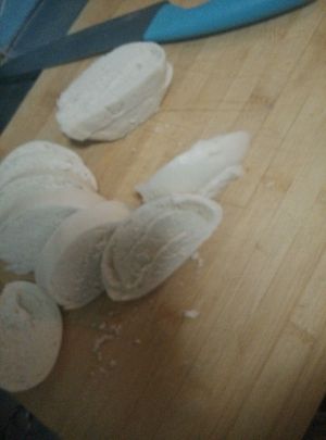 用刀切开后如图示,黑白相间。我们可以清晰看到表面还不甚光滑仍有些许气孔,说明揉搓得不够彻底,由于是初试牛刀所以大家就见谅吧