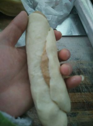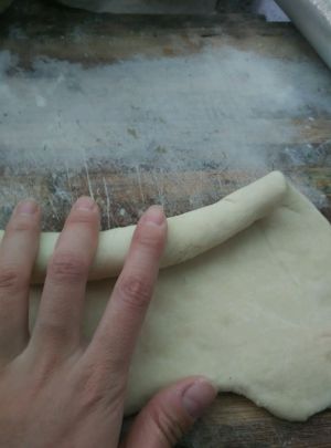 发酵好后,使劲揉捏按压,挤出面团的空气,接着搓成长团状