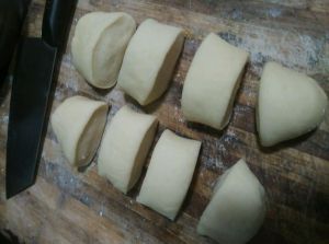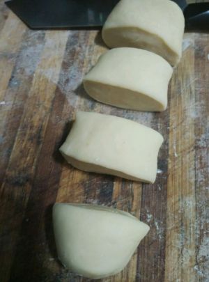 揉面:将发酵好的面团再次使劲揉至体积缩小,内部空气被挤出后揉成条,将揉好的面条切块成大小合适的剂子