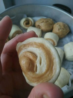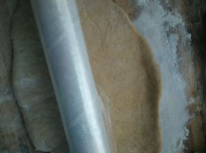 这是加了黑糖的面团用擀面杖擀成薄片,这里没有擀面杖我用整捆保鲜膜代替