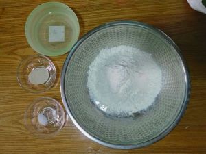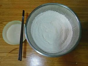 准备好所有材料,面粉250克,温水125克,发酵粉3克,少许白糖,一点点盐。