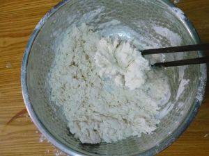 先把糖和盐倒进面粉里,搅拌均匀,然后把发酵粉倒入温水里,搅拌均匀,最后把发酵水分三至四次的倒入面粉里,边倒边用筷子搅拌,搅拌成絮状。