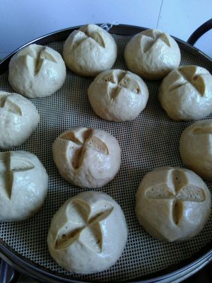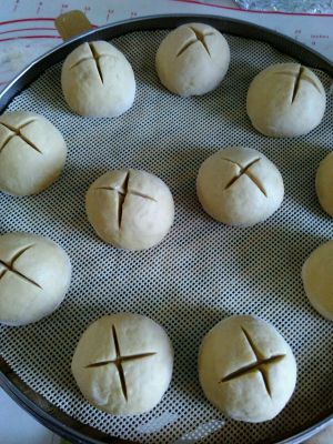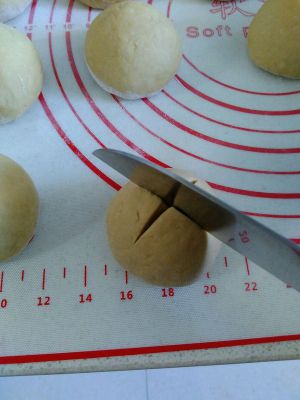分成80克一个的小面团,揉匀定型,用刀在表面划上十字。