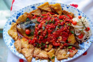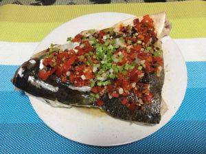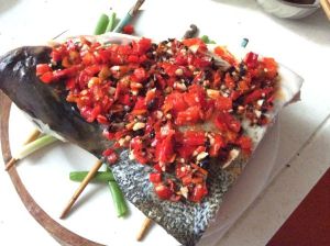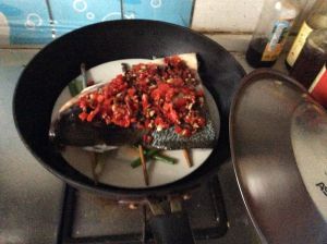 剁椒在油里爆香,入葱丝,浇在鱼头上。