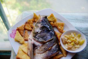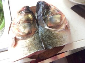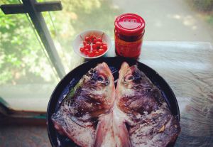 先把鱼头分成2半,用花雕酒、料酒、柠檬汁、姜片、少量盐腌制鱼头,再在鱼头表面抹一层面粉。姜蒜油锅爆香盛出
