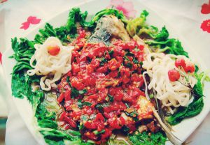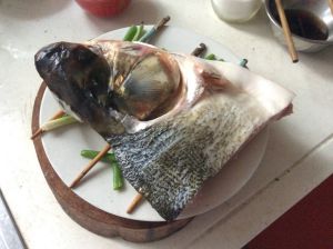 鱼头太大只好一分为二装了2 个盘,再配上筋到的手擀面,大功告成。