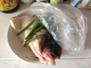取半片鱼头放在大碗里,放料酒,葱,姜,少许盐均匀摸在鱼头上,套上保鲜袋,放入冰箱腌制2小时。