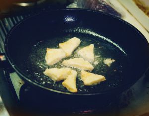 冻豆腐切块,沾上玉米淀粉,放油锅内炸至金黄色,盛出