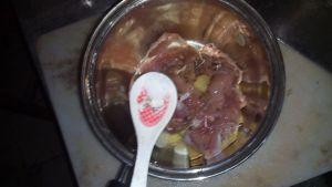 生抽耗油料酒五香粉,胡椒粉盐姜片腌半小时以上,爱吃辣放了一点豆瓣酱