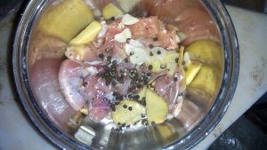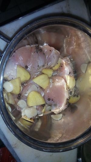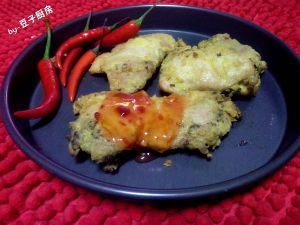将所以的佐料放入大碗中调匀(蒜和姜剁得越细小越好)将鸡胸肉分别沾上抹匀佐料后再放回该大碗中,腌制十小时。