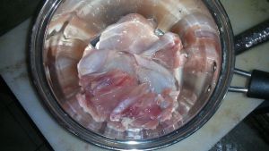肉入味了 把肉拿出来放在菜板上 用刀背拍扁!(我用的擀面杖、得劲儿 哈哈)