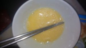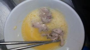 将蛋打散,放入1:1的玉米淀粉和面粉并加水搅拌均匀成清状,将腌好的鸡肉放入,正反粘上浆。