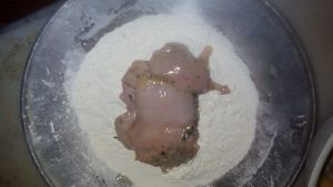 把锅里道油 油开了 小心的把裹好配料的鸡肉放入锅中 等鸡排表面炸成黄色就可以吃了