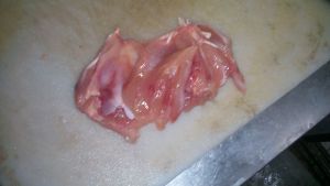 把鸡胸肉用刀背顺着鸡胸肉条纹拍打