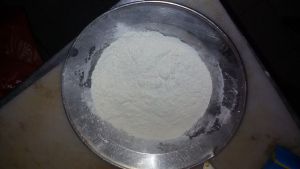 然后准备好面粉。面包糠。鸡蛋 都放在平盘里
