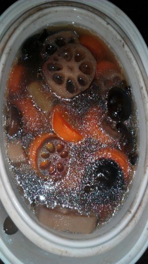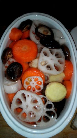 将莲藕、胡萝卜、香菇、姜片统统放入炖锅中,对了,还要放上两颗大料,再倒入少量料酒